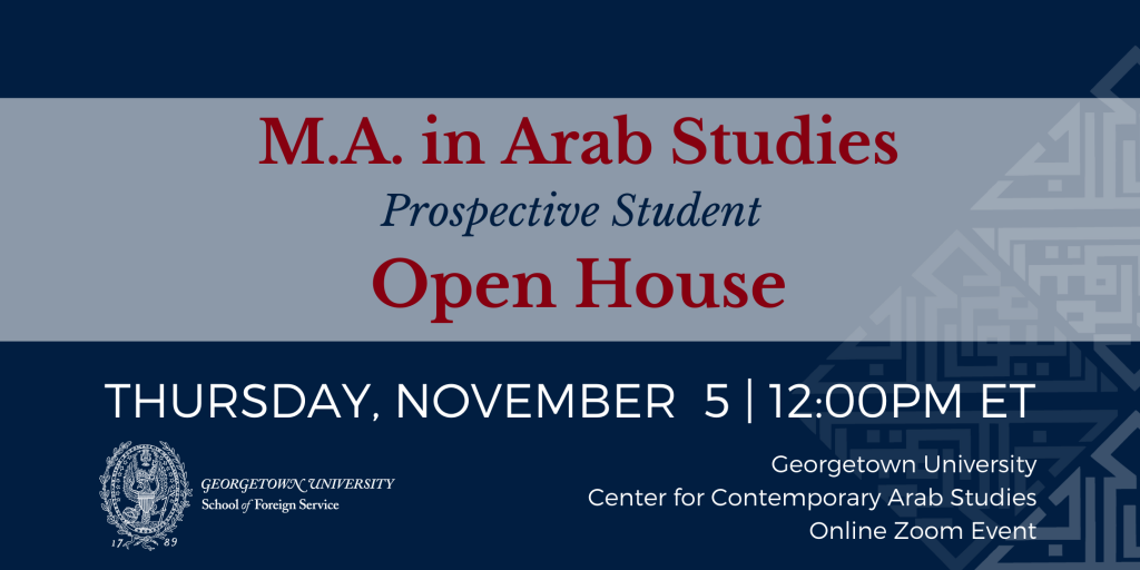 Join us Thursday, November 5 at 12:00 pm (EST). Join us to learn about the Master of Arts in Arab Studies, the admissions process and scholarships, and to hear from faculty…