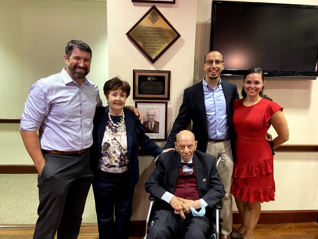 If you ask a CCAS faculty member to name a pioneer in advancing the study of the contemporary Arab world, most will undoubtedly raise the name of Dr. Ibrahim M. Oweiss, professor emeritus at the School of Foreign Service and one of the founding members of CCAS. To honor his immense contributions to the center, CCAS dedicated a plaque to Professor Oweiss at a small gathering led by CCAS Director Dr. Joseph Sassoon on Professor Oweiss’ 90th birthday in September 2021. The dedication event was attended by Oweiss, his wife and retired Georgetown French professor Celine Oweiss, and several members of their family, each of whom have their unique ties to Georgetown (see photo).