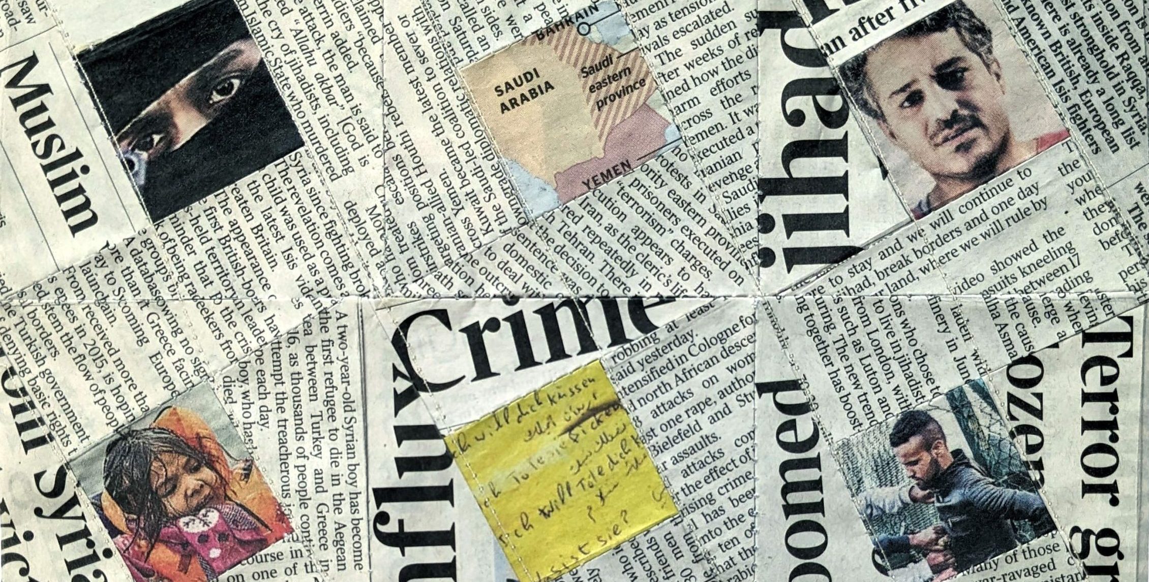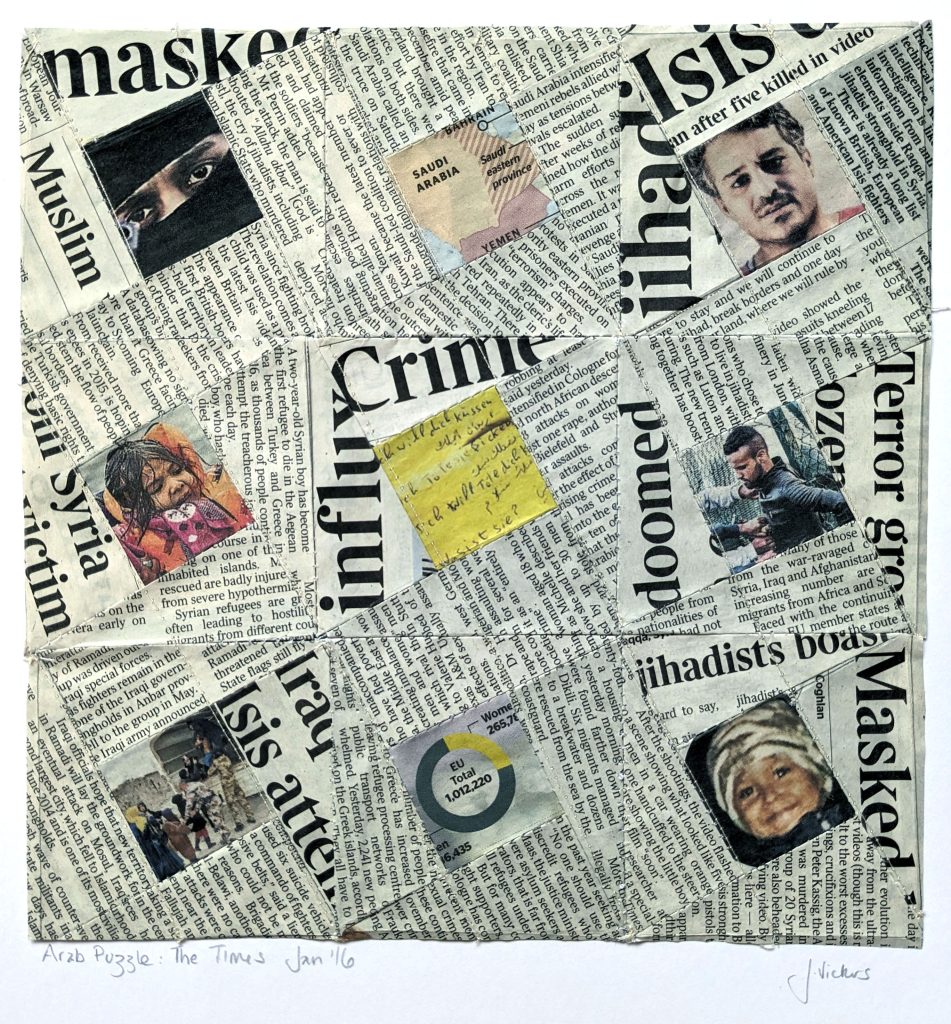 Newspaper and stitch collage by Jennifer Vickers