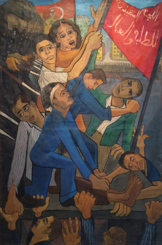 In February 1946, Egyptian students and laborers marched on Abbas Bridge connecting Old Cairo and Giza to protest the policies of Prime Minister Mahmoud Fahmy Nokrashy (1888-1948). The police pushed back by opening the movable bridge and “leaving many of [the protesters] to fall into the Nile or get trampled in the stampede.” The scene of huddled students dangling from the seams was captured by Egyptian artist Gazbia Sirry (b.1925) in her 1955 painting Abbas Bridge, now in the collection of the Museum of Modern Egyptian Art in Cairo.
