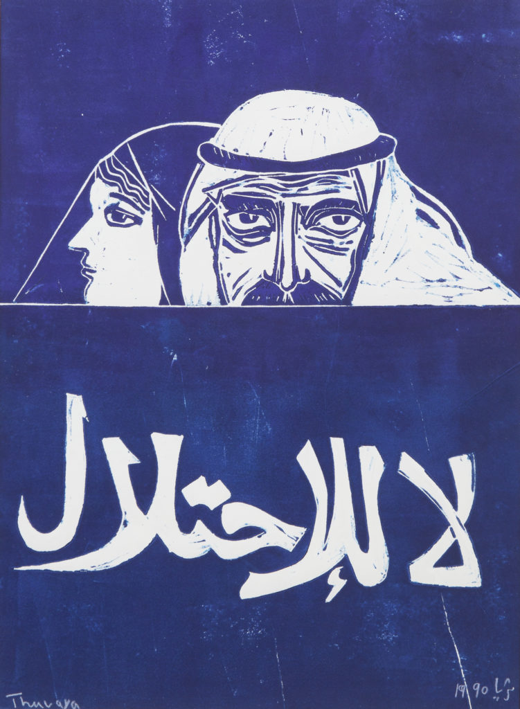 Other parts of the Arab world also saw women artists depict political and social moments of the 20th century. Artist Safia Farhat (1924-2004) who, in 1966, became the first Tunisian—and also the first female—head of the Tunis Institute of Fine Arts, depicted scenes of laborers and fishermen as part of her socially-driven activism through art. Her 1952 portrait of Farhat Hached (1914–1952), founder of the General Union of Tunisian Workers and pro-independence leader for whom her husband worked, depicts Hached in a brown suit and red tie. Researcher Jessica Gerschultz writes in her recent book Decorative Arts of the Tunisian École (2019) that the portrait shows Hached in the same clothes he was wearing on the December 5, 1952—the day he was assassinated by a French extremist group. Kuwaiti artist Thuraya Al-Baqsami’s (b.1952) lino-cut print from the year 1990, depicts a resilient Kuwaiti man and woman wearing traditional clothes, with the Arabic phrase “No to the Occupation” rendered in white across the artwork. In response to the Iraq-Iran war, which raged between 1980 and 1988 and caused countless deaths, Bahraini artist Balqees Fakhro (b.1950) created a painting titled Face to Face (1986) as an artistic call for peace at an especially brutal moment during the eight-year conflict. It depicts a Sumerian king, who represents Iraq, and a Persian Achaemenid emperor, who represents Iran, sitting on the banks of the Shatt al-Arab River and extending their hands in friendship.